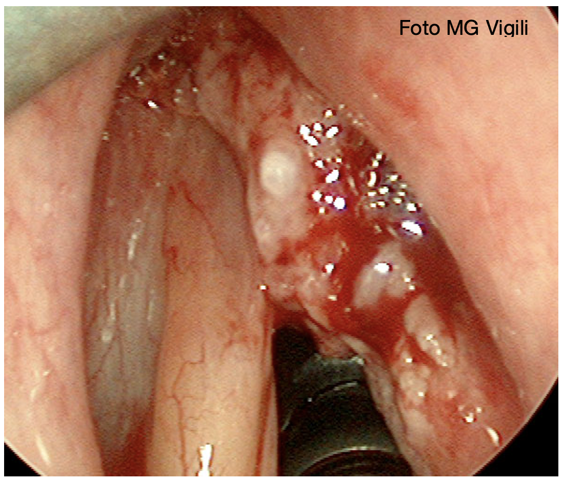 Gli obiettivi primari del follow up riguardano la individuazione precoce di recidive locali e/o locoregionali, l’identificazione di metastasi a distanza o sviluppo di tumori metacroni, oltre che la valutazione funzionale, le complicanze, l’esposizione a fattori di rischio e la qualità di vita di questi pazienti. I tumori esclusivamente glottici raramente metastatizzano nei linfonodi del collo, per cui l’attenzione è principalmente locale con videolaringoscopia transnasale, possibilmente implementata da WL ed NBI. La laringoscopia nei pazienti post chirurgici è più agevole rispetto ai pazienti radiotrattati per l’assenza di edema cronico e la presenza di epitelio più appiattito. Inoltre la rimozione intraoperatoria delle false corde migliora la visione delle aree critiche quali ventricolo di Morgagni, regione sottoglottica e petiolo dell’epiglottide.
